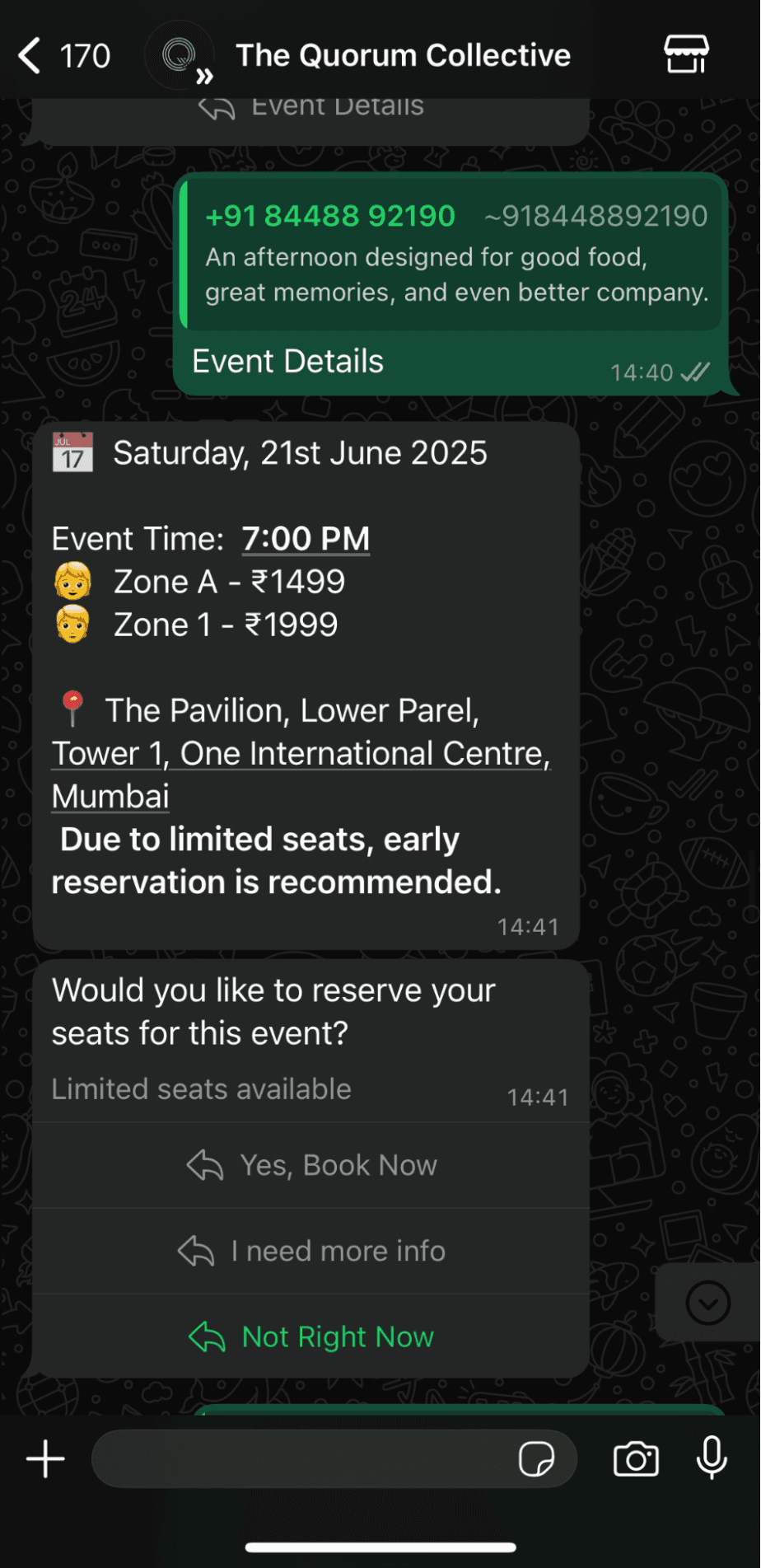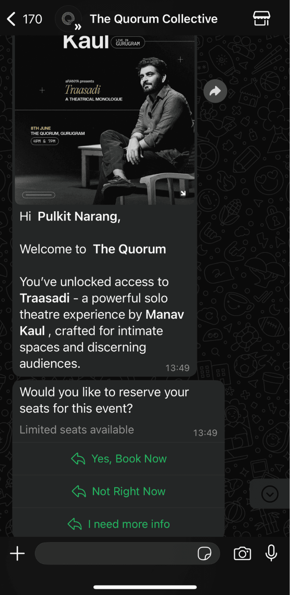 The Quorum Collective runs premium cultural programming across Mumbai, Gurugram, and Hyderabad—theatre performances, music nights, mixology experiences, and art pop-ups hosted at their venues. Their campaigns attracted the right audience, but their booking funnel didn't match the experience: generic forms, high drop-off rates, and acquisition costs that made scaling prohibitively expensive.