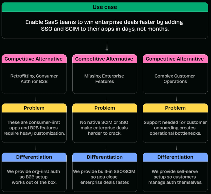 To understand Scalekit's positioning challenge, we researched why their features weren't converting prospects. We needed to create a narrative that made the differentiation immediately clear and gave the sales team a story they could actually use in conversations.