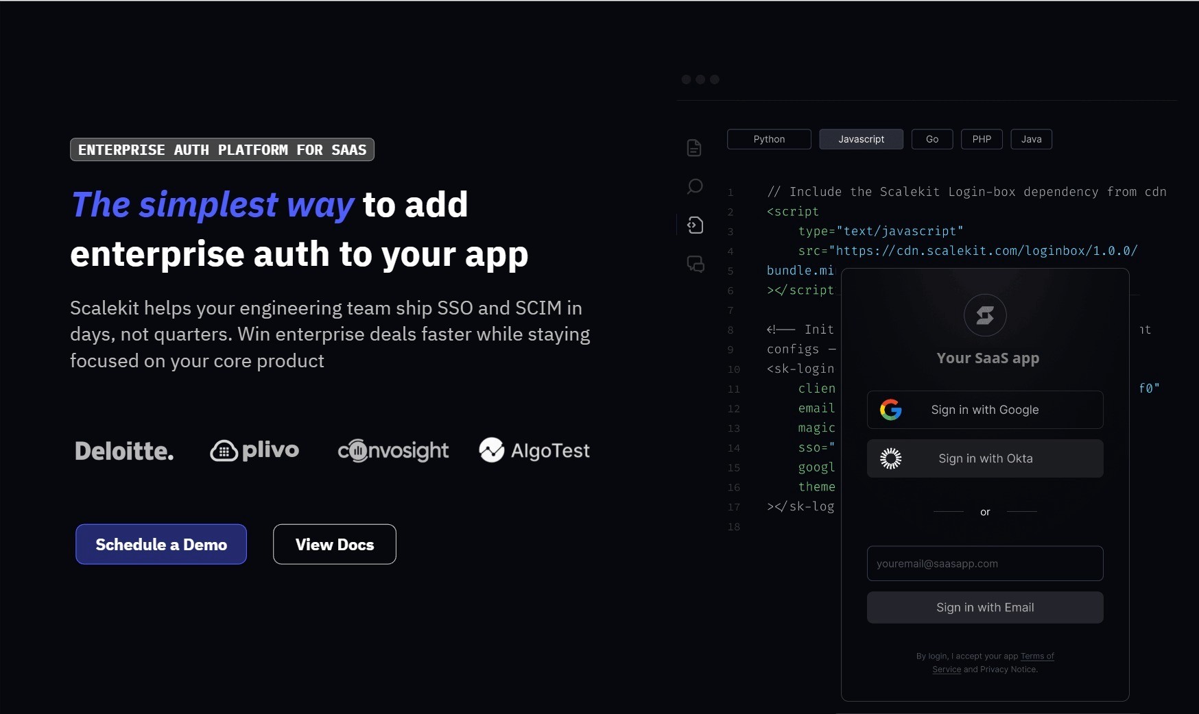 Scalekit is designed from the ground up for multi-tenant SaaS environments. It offers features such as SSO (Single Sign-On) and SCIM (System for Cross-domain Identity Management) as ready-to-deploy SDKs and APIs.